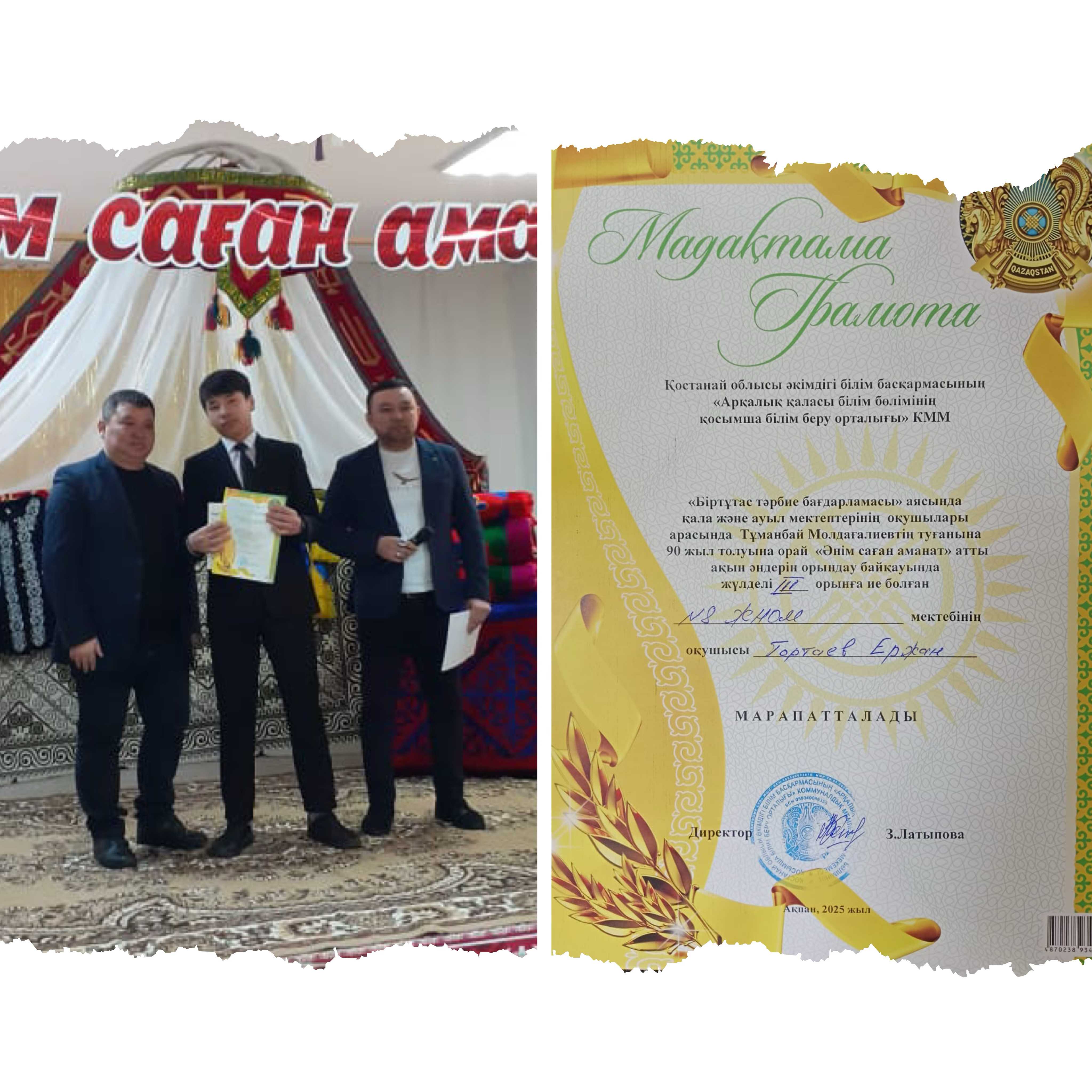 «Әнім, саған аманат» атты ақын әндерін орындау байқауында 9 сынып оқушысы Тортаев Ержан жүлделі ІІІ - орынға ие болды.