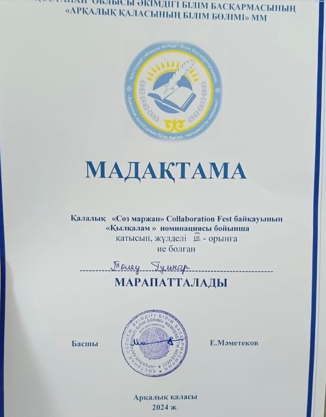 9 - сынып оқушысы Тортаев Ержан Көркемсөз номинациясында ІІІ - орын иеленді