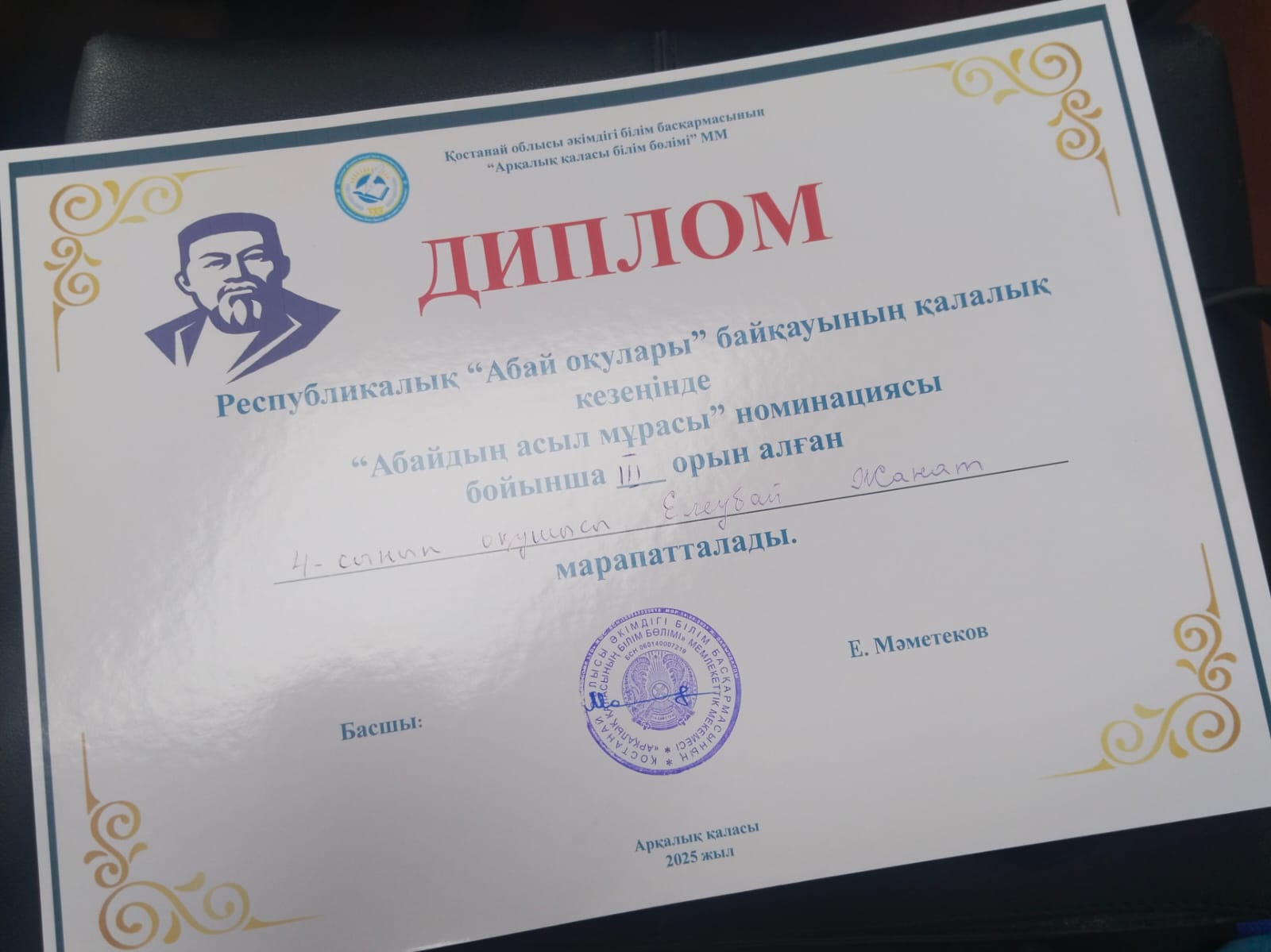 I орын,Елеубай Жанат 4 - сынып оқушысы - «Абайдың асыл мұрасы» номинациясы бойынша