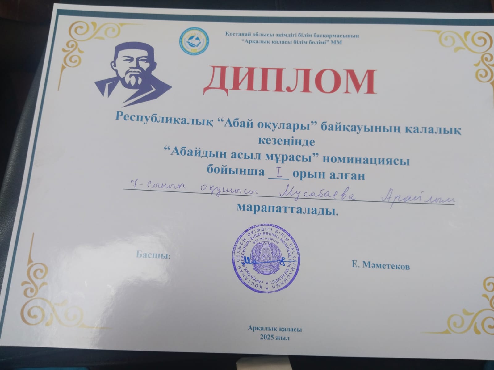 Мусабаева Арайлым 7 - сынып оқушысы - «Абайдың асыл мұрасы» номинациясы бойынша