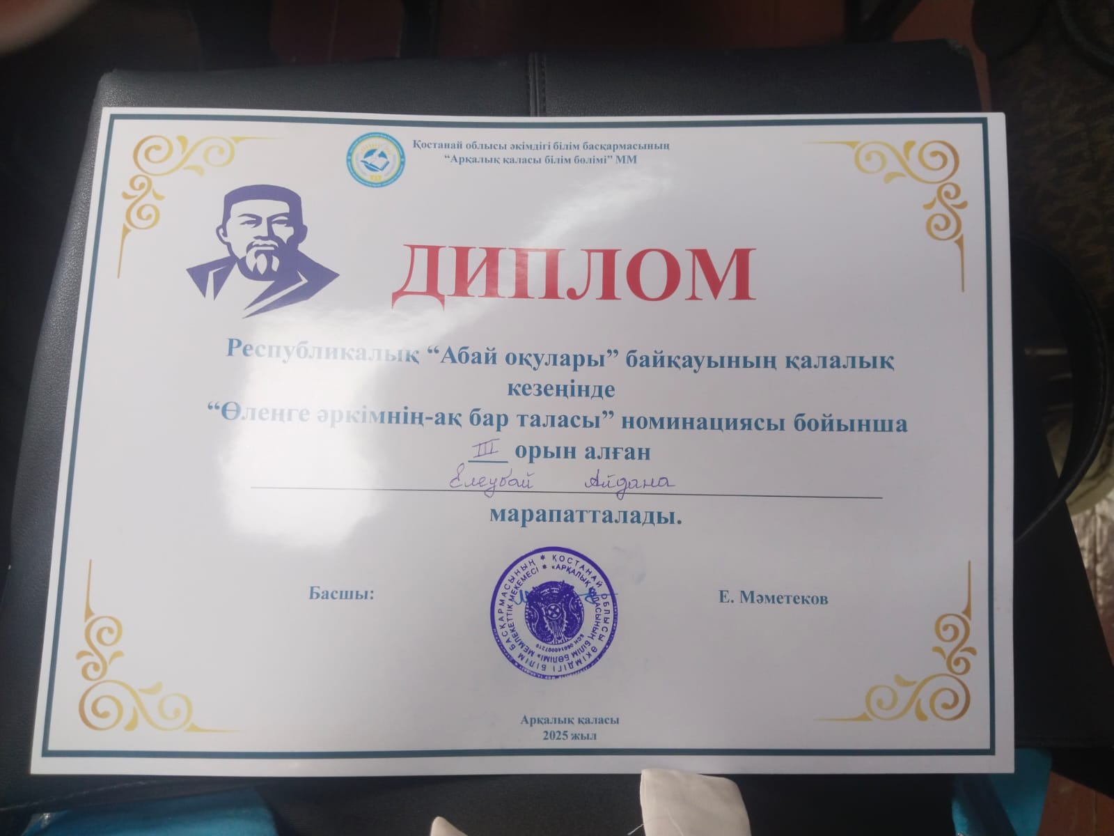 IIІ - орын,Елеубай Айдана - «Өлеңге әркімнің - ақ бар таласы» номинациясы бойынша III орын иеленді.