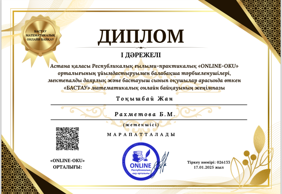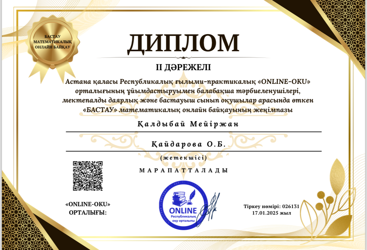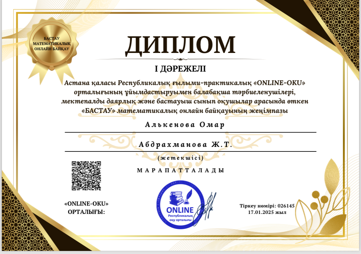 Астана қаласы ғылыми - практикалық "ONLINE - OKU" орталығының ұйымдастыруымен балабақша тәрбиеленушілері, мектепалды даярлық және бастауыш сынып оқушылары арасында өткен "Бастау" математикалық қашықтықтан байқауының жүлдегерлері