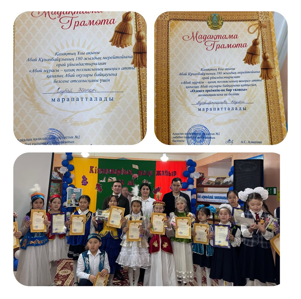 Арқалық қаласы облыстық №2 әмбебап ғылыми кітапханасы ұйымдастыруымен қазақтың ұлы ақыны Абай Құнанбайұлының 180 жылдық мерейтойына орай ұымдастырылған «Абай мұрасы - қазақ поэзиясының шыңы» атты қалалық Абай оқуларында 5 сынып оқушысы Муханбетжан Аяулым «Өлеңге әркімнің - ақ бар таласы» номинациясына бойынша және 4 сынып оқушысы Елеубай Жанат Дарханқызы белсене атсалысқаны үшін марапатталды.