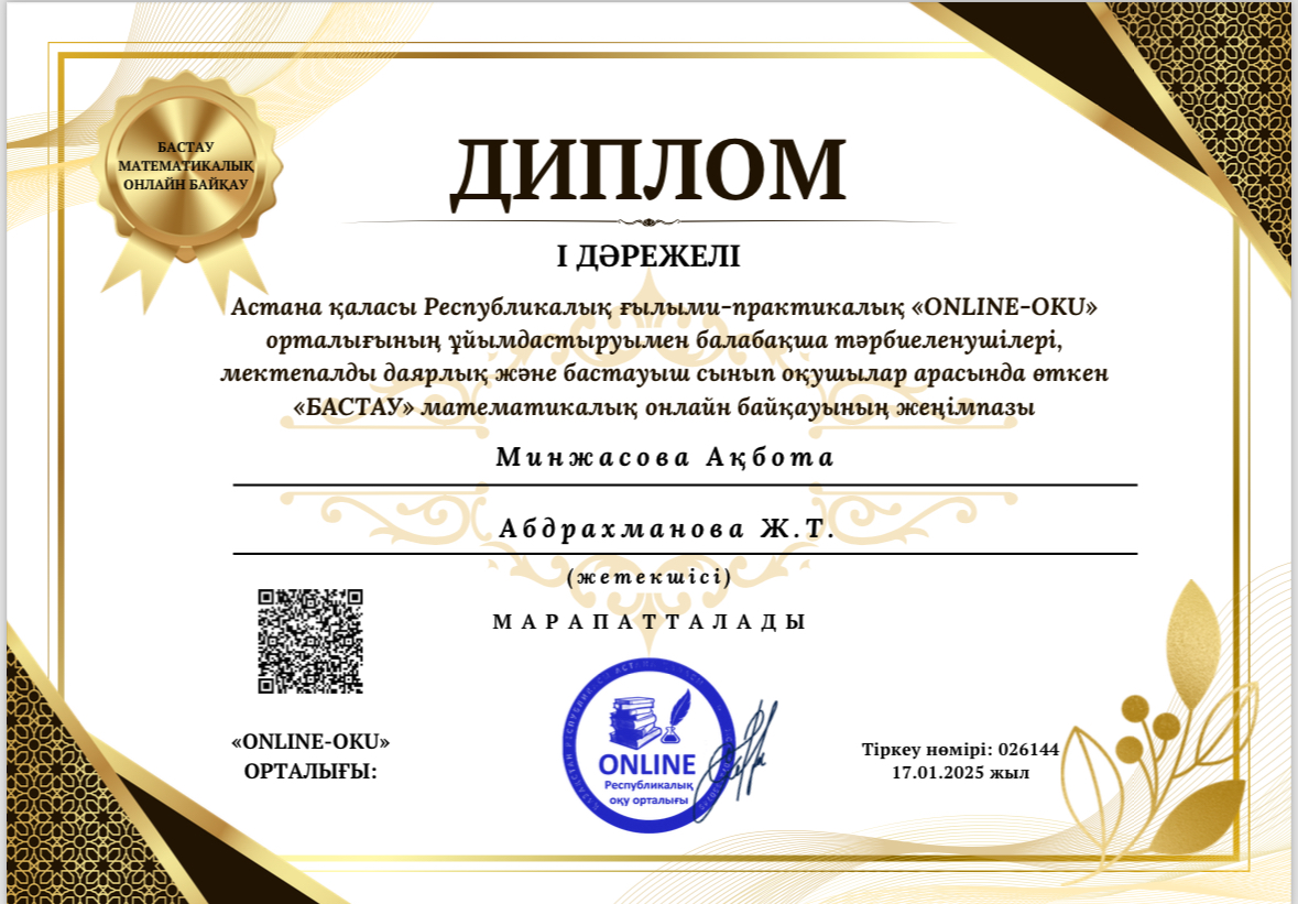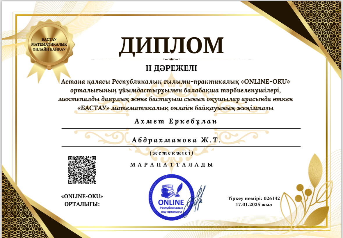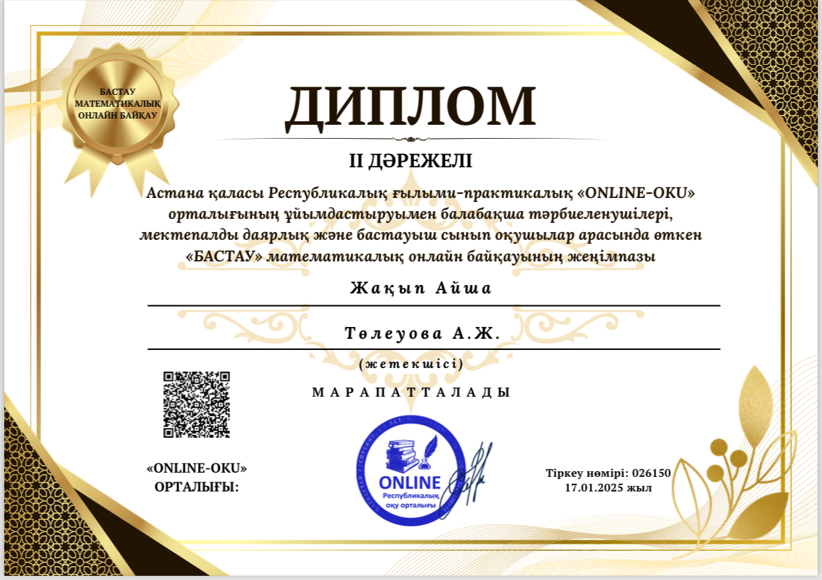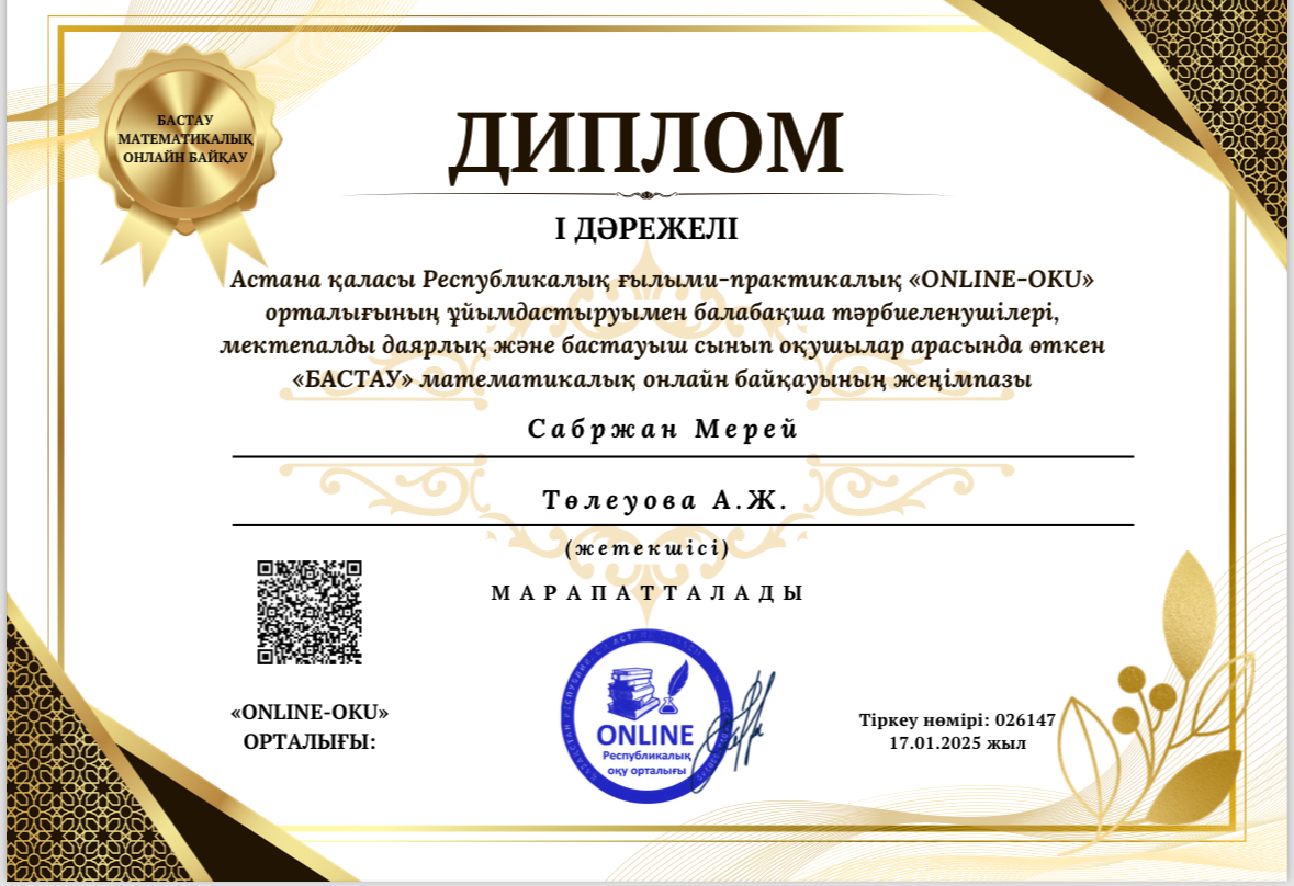 Астана қаласы ғылыми-практикалық "ONLINE-OKU» орталығының ұйымдастыруымен балабақша тәрбиеленушілері, мектепалды даярлық және бастауыш сынып оқушылары арасында өткен"Бастау » математикалық қашықтықтан байқауының жүлдегерлері;
