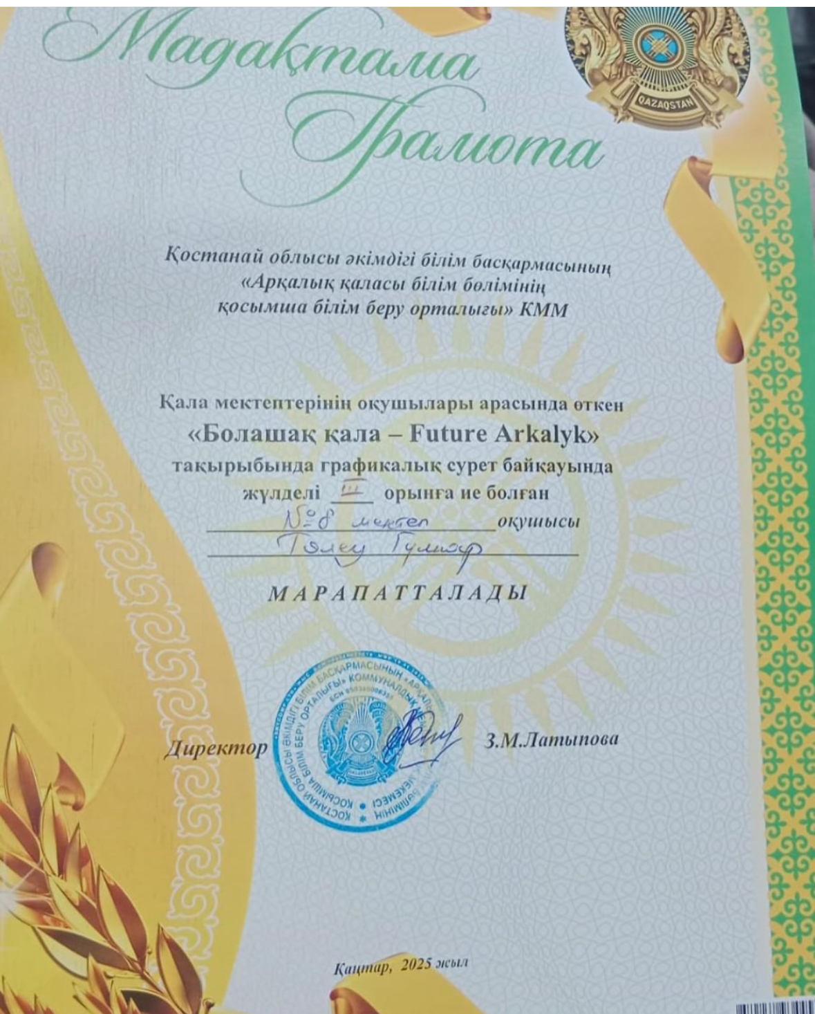 22 қаңтар күні қала мектептерінің оқушылары арасында өткен "Болашақ қала - Future Arkalyk" тақырыбында графикалық сурет байқауында жүлделі III орынға №8 негізгі орта мектебінің оқушысы Төлеу Гүлнар марапатталды. Жетекшісі: Нағашыбай Айкүнім Шаймерденқызы.